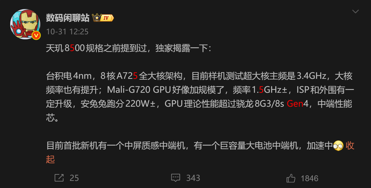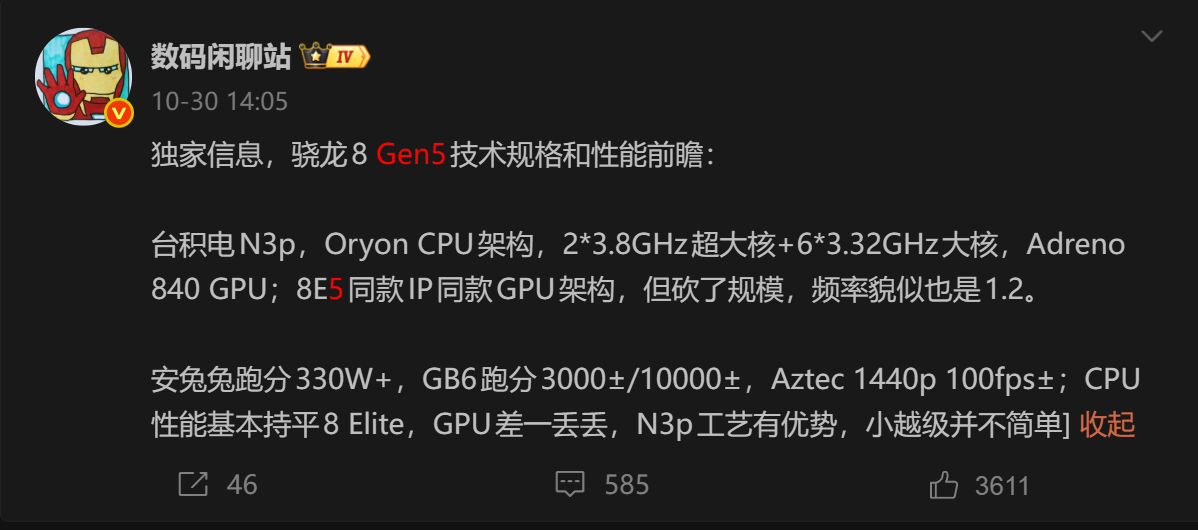 | 诶,说实话,我本以为手机圈的内卷大戏唱了这么多年,各家厂商也该累了,准备鸣金收兵,让大家安安生生过两年。 没想到,这股风潮非但没有停歇,反而愈演愈烈。 你看这旗舰市场,前脚搭载骁龙8 Elite Gen5和天玑9500的机型还在神仙打架,打得难分难解,后脚关于下一代旗舰芯片的传闻就已经满天飞了,仿佛在催促着手机厂商们:搞快点,再搞快点。 大家似乎都憋着一股劲,仿佛谁先放慢脚步,谁就会被市场的滚滚洪流所吞没。 不过嘛,这些定位旗舰的机子,虽然配置和性能都很给力,但价格对学生党来说就不太友好了。 比起性能和质感全面提升的次旗舰,既不喜欢拍照、又对材质无感的当代大学生,或许更想知道厂商们捏在手里的那几款性价比杀器什么时候才能落地,那批中端神机啥时候能迎来迭代更新。 如果你也有同样的想法,那恭喜你,接下来有好消息了。 ![]() (图源:微博) 近日,据博主数码闲聊站透露,高通和联发科都传出了重磅新品的消息。高通那边,准备了性能堪称恐怖的骁龙8 Gen5;而联发科这边,则同样准备了一颗主攻中端市场的新品——天玑8500。 一场围绕次旗舰市场的风暴,即将来临。 自研架构,高通中端芯稳了 我们先来说说高通。 在过去几年里,尽管骁龙芯片在高端市场依旧占据着绝对的领导地位,但大家也能感觉到,联发科在能效和峰值性能上的持续进步,确实让高通感受到了前所未有的压力,而骁龙8s系列显然已经无法满足市场的期待了。 于是,高通决定——亮剑。这把剑,就是传闻已久的骁龙8 Gen5。 ![]() (图源:微博) 它最大的不同,在于高通这次似乎下定决心,要跟沿用多年的ARM公版CPU架构说再见了。 骁龙8 Gen5采用最新的台积电N3P工艺打造,CPU升级为Oryon架构,由2颗 3.8GHz Oryon-L超大核+6颗3.32GHz Oryon-M大核组成,在核心规模上基本对齐骁龙8 Elite。 在我看来,自己从头造的好处显而易见,不再受限于公版设计的条条框框,可以最大程度地去挖掘潜力,实现性能和能效的更优解。 最重要的是,随着Oryon架构进一步下沉,高通的研发成本将会得到充分的稀释。 ![]() (图源:高通) 不过GPU这边,尽管沿用了骁龙8 Elite Gen5同款IP与架构,但在规模上却略有缩减,从12CU削减至8CU,运行频率则维持在1.2GHz,整体GPU性能不仅略低于前者,对比骁龙8 Elite也会有一定差别。 旗舰同宗同源的架构,和相对降低的核心频率,让骁龙8 Gen5在安兔兔中取得了330万分左右的综合成绩。 作为对比,骁龙8 Elite普遍宣传的跑分成绩,基本就差不多这水平。 考虑到制程工艺上的进步,以及在极限性能上的削弱,预计这枚中端芯片在低频能效比上面的表现应该不错,但是更低的缓存规模,使其在进行高频任务(如游戏)时,需要频繁和内存交换数据,高频能效比还有待观察。 只能说,比起“青春版”骁龙8 Elite,高通或许更希望它能以骁龙8 Gen5的身份被记住。 挖掘ARM潜力,联发科要靠全大核赢 当高通正忙着打造自己的自研架构时,它的老对手联发科,则在另一条赛道上全速前进。 联发科选择继续深挖ARM公版架构的潜力,力求将这套成熟的方案打磨到极致。 先来看看天玑8500,也就是负责走量那个。 ![]() (图源:微博) 按照数码闲聊站的说法,天玑8500将采用台积电成熟的4纳米工艺,同时会继续采用A725全大核架构,由1*3.4GHz A725核心+3*3.20GHz A725核心+4*2.4GHz A725核心组成,力争在成本和功耗上取得平衡。 提升比较夸张的,是这次的GPU。 天玑8500预计将会继续采用Mali-G720 GPU,属于是天玑9400同款GPU IP,同时核心数量可能会增加到10-12颗,同时会在一定程度上提高运行频率以提高游戏表现,预计频率会提升到1.5GHz左右的样子。 ![]() (图源:ARM) 这样的设计,让天玑8500的理论性能直接起飞,安兔兔跑分来到220万分。 不仅如此,这次联发科对GPU性能异常有信心,预计理论性能超越骁龙8 Gen3/骁龙8s Gen4,直接来到主流3A游戏无忧的水平。 当然了,为了对标骁龙8 Gen5,联发科这边还有一颗独特的杀手锏—— 天玑9400++,或者叫天玑9500e。 和今年类似的是,这颗处理器应该会基于天玑9400打造,采用Cortex-X925大核和Immortalis-G925 GPU,在内核超频的同时,轻度削减外围的周边配置,以此实现在性能上紧咬骁龙8 Gen5不放的设计。 联发科的策略很明确:你高通玩自研,投入大风险高,我则紧跟ARM的步伐,稳扎稳打,用更成熟的方案和更高的性价比来赢得市场,这种策略在过去几年,已经被证明是行之有效的,天玑9000系列的出色表现就是最好的证明。 ![]() (图源:一加) 现在唯一的问题是,在天玑9400旗舰清仓的背景下,天玑9500e会不会像它的前辈那样, 落得个事实性独占的下场呢? 中端手机战事:拼处理器更拼刀法? 聊完了令人兴奋的部分,我们再来谈一个现实的问题:成本。 处理器性能的飞跃固然可喜,但手机并不是只有处理器的。坏消息是,从今年下半年开始,手机的另一大核心部件——内存和闪存,开始进入了新一轮的涨价周期。三星、海力士等主要供应链更是宣布,将在第四季度把DRAM和NAND闪存的价格上调最多30%。 这意味着,手机厂商们明年造手机的成本,又要高出一截了。 问题就出在这里,存储成本上升了,但是产品还是得按照既定流程推出去。那些准备首发骁龙8 Gen5和天玑8500的手机厂商,比如我们熟悉的一加、Redmi、iQOO等,会怎么做呢? 答案很可能是,更加精准的“刀法”。 为了控制成本,将手机的价格维持在一个有竞争力的水平,我们很可能会看到这些次旗舰新机在