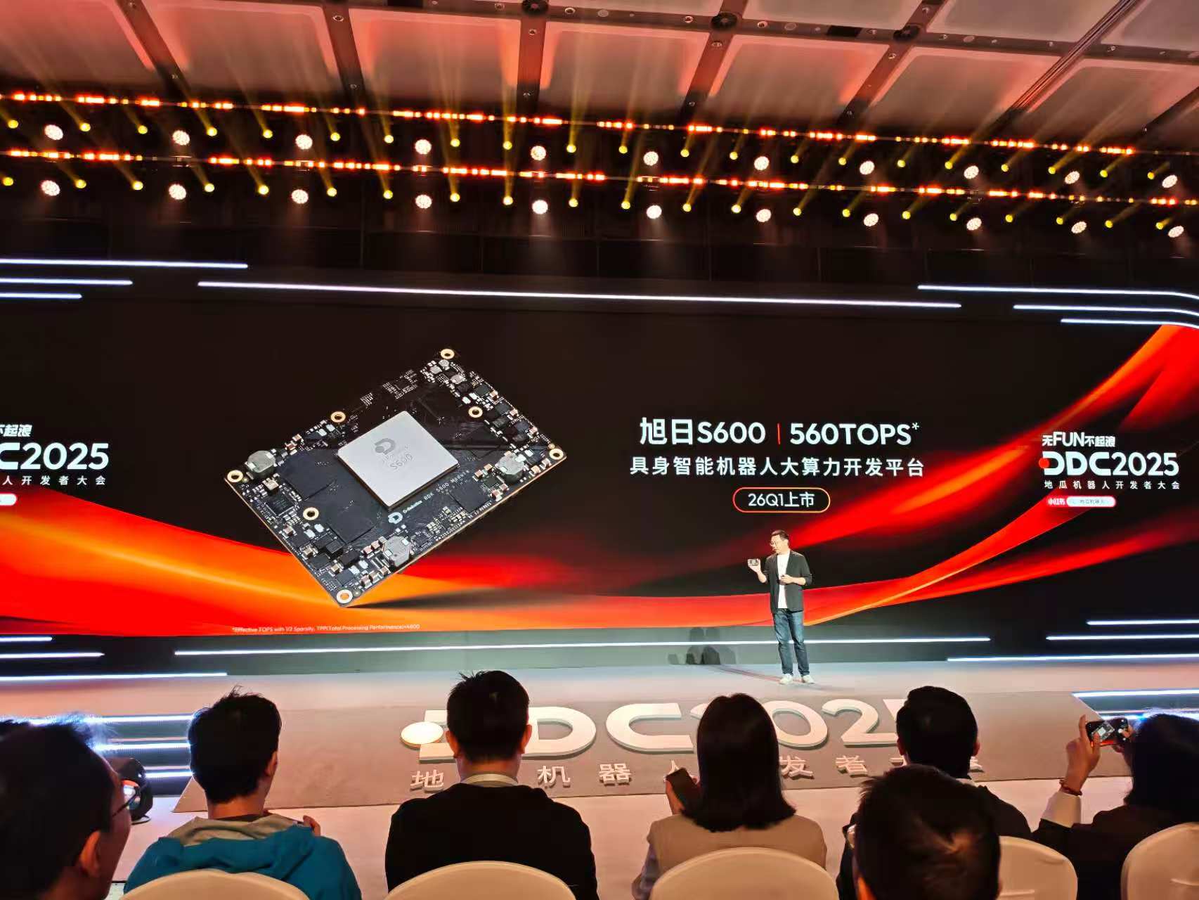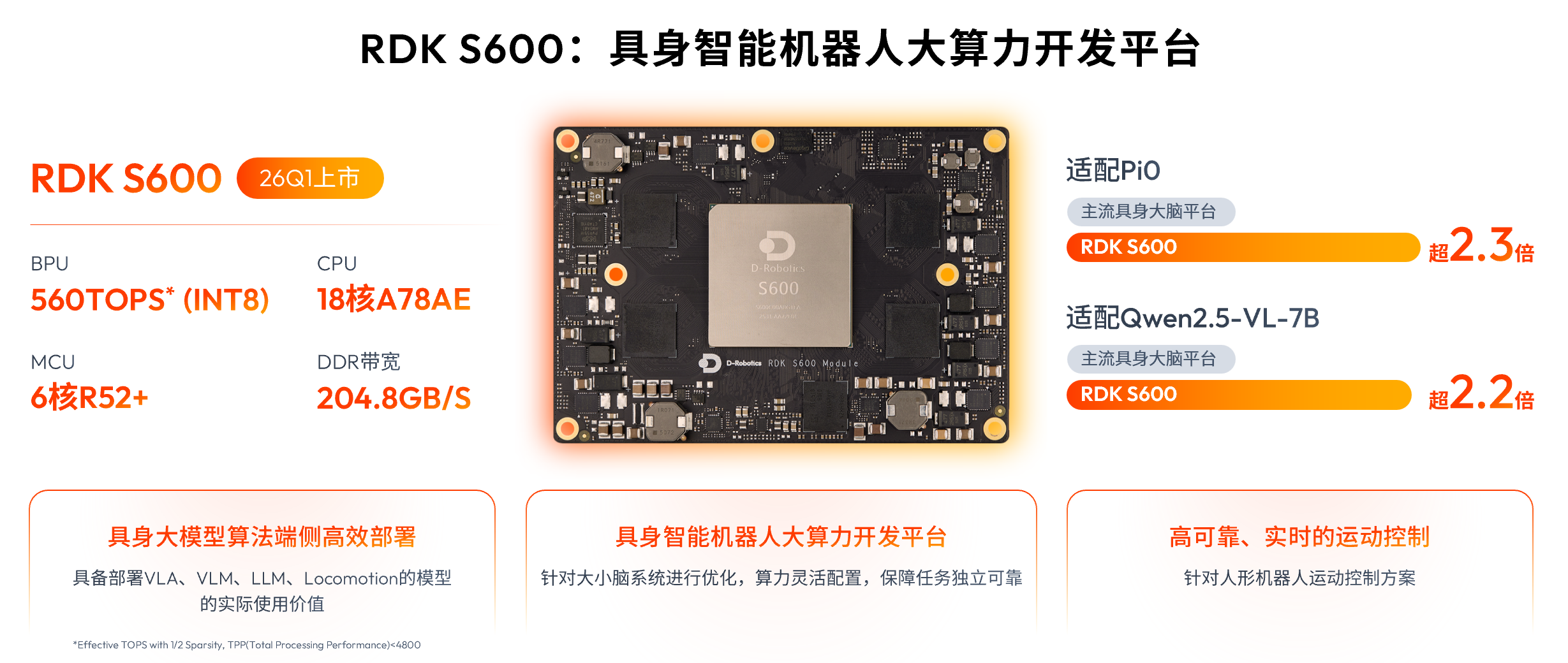 | 什么是今年硬科技领域最热门的行业?以人形机器人为代表的机器人行业,当之无愧。 今年,更是被誉为人形机器人量产「元年」。报告预测,2025 全年中国具身智能市场规模将达 52.95 亿元,约占全球市场的 27%;人形机器人市场规模将达 82.39 亿元,约占全球市场的 50%。 人形机器人之外,服务机器人、工业机器人、特种机器人的加速应用浪潮,更早推开。机器人应用的大时代,已然拉开帷幕。 各式各样的机器人应用,如果想去开发的话,是否可以有一套通用平台工具,甚至是支持「傻瓜式」操作的技术工具呢? 作为地平线控股子公司,地瓜机器人致力于为具身智能前沿科研探索、消费电子智能化升级、新兴品类机器人孵化提供全链路的开发基础设施。 近日,DDC 2025 地瓜机器人开发者大会在深圳举办,雷科技受邀参加。 ![]() 深圳前海国际会议中心(雷科技摄制) 机器人开发有多热?地瓜这个会给出了答案 今年的机器人应用开发,有多热? DDC 2025 主题演讲开场,地瓜机器人 CEO 王丛就说道,「去年开发者大会就两百多人规模,今天现场参加主题演讲的大概得有六七百人的样子」。 定位软硬件通用底座提供商,地瓜机器人拥有从芯片、算法到软件的完善产品体系,可满足人形、四足狗、家庭服务、陪伴、物流 AMR 等多种机器人的全栈计算与开发需求。过去一年,地瓜机器人出货量同比增长 180%,客户数量同比增长 200%。 今年 6 月,地瓜机器人刚发布行业首款单 SoC 算控一体化机器人开发套件 RDK S100。半年时间不到,DDC 2025 上,地瓜机器人又带来了 「旗舰级」具身智能机器人大算力开发平台 S600 的预览,并宣布将于 2026 年第一季度正式发布;同时,推出了覆盖数据闭环系统、具身智能训练场、Agent 开发服务的全新「地瓜机器人一站式开发平台」。 ![]() (雷科技现场摄制) 其中,S600 具身智能机器人大算力开发平台,拥有 560 TOPS*(INT8) 算力,采用高效灵活的「大小脑」架构设计,并进行了深度优化: 「大脑」配置 18 核 A78AE CPU 和全新 BPU Nash,可支持 VLA、VLM、LLM、Locomotion 多种具身大模型算法端侧高效部署,尤其是在适配 Pi0、Qwen2.5-VL-7B 时,性能分别超越主流具身大脑平台 2.3 倍和 2.2 倍,满足复杂决策需求; ![]() 「小脑」配置 6 核 R52+ mcu,专为人形机器人优化,具备高可靠、实时的运动控制能力。 *Effective TOPS with 1/2 Sparsity, TPP(Total Processing PeRFormance)<4800 地瓜机器人宣布,傅利叶、加速进化、自变量机器人、星动纪元、北京人形机器人创新中心、人形机器人(上海)有限公司、逐际动力、广汽集团等成为 S600 全球首批战略客户;知行科技、天准星智、华勤技术、立讯精密、金脉电子、晨讯科技等成为 S600 生态首批合作伙伴,并共同打造机器人控制器。 ![]() DDC 2025 展区,汇聚地瓜机器人生态客户和开发者 全新「地瓜机器人一站式开发平台」,以「软硬结合 + 端云一体」协同的开发体系,全面满足机器人开发对数据闭环、仿真、模型训练与部署以及开发效率提升的全链路需求,让机器人开发更简单。该平台提供三大服务:
