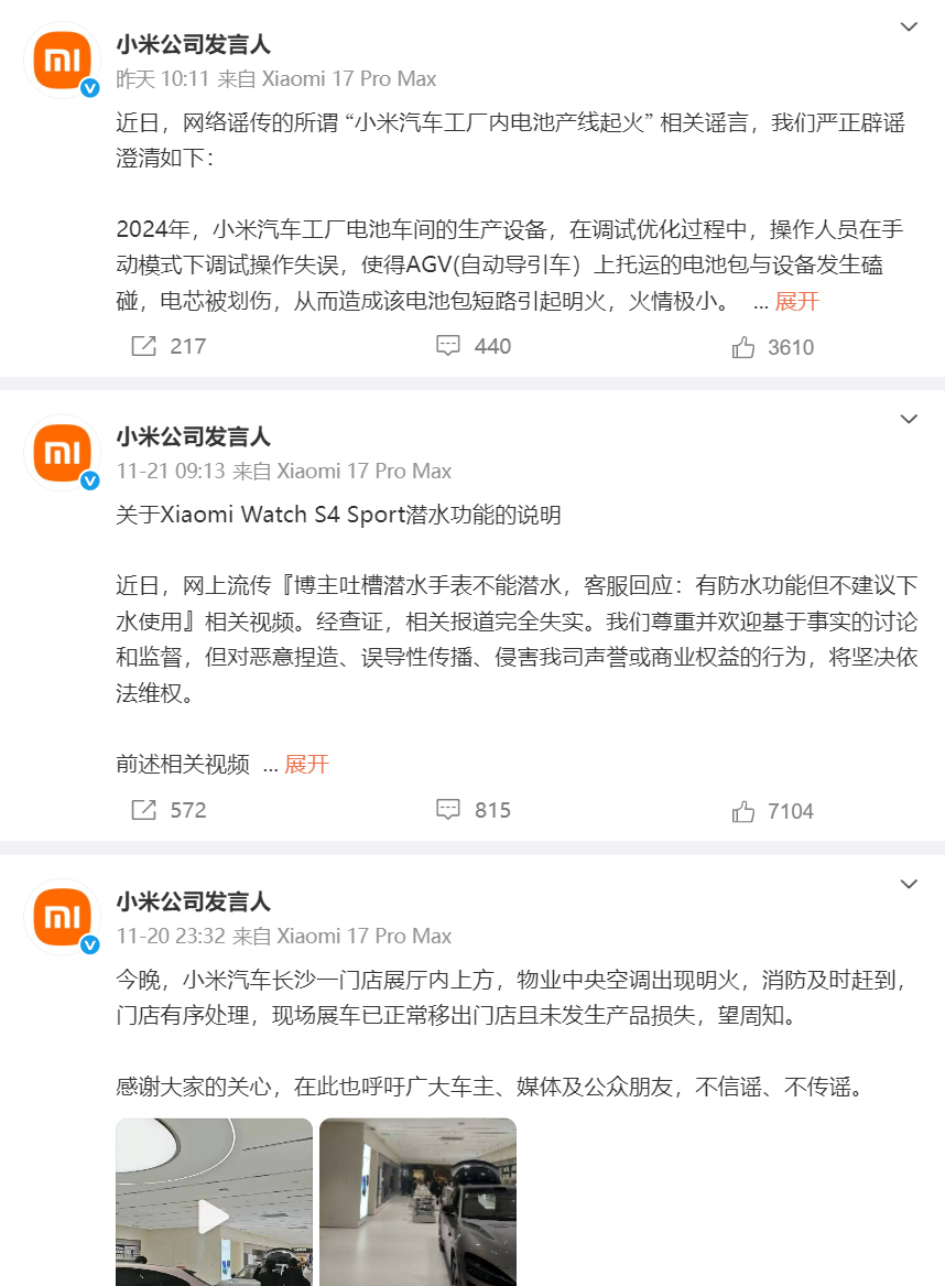 11月24日消息,日前小米汽车副总裁李肖爽发表声明称,“小乔地铁站周边发生车祸致 8 人死亡”这一网络传闻纯属子虚乌有,和小米毫无关联,呼吁广大网友切勿轻信、传播此谣言。![]() 图源:微博 从李肖爽所展示的图片内容可知,“网信郑州”进行了辟谣声明:近期有网络平台账号发布消息,宣称“小乔地铁站处小米M7达成‘8杀’,创下单车最高击杀纪录” 。新郑市相关部门经核实后明确,这起事件实际发生在2025年5月21日,事故原因是驾驶员操作出现失误导致4人受伤,并未造成人员死亡。网络上流传的相关信息均为不实谣言,在此呼吁广大民众切勿轻信谣言。 值得一提的是,小米集团新任公关部总经理徐洁云在李肖爽评论区留言“望周知”。 ![]() 图源:微博 上周小米集团进行了人事调整,原公关部总经理王化调任至小米武汉总部,其职位由徐洁云接任。但徐洁云并非首次担任该职务,他此前就曾有过小米集团公关部总经理的任职经历。目前徐洁云除担任小米集团董事长特别助理、战略市场部副总经理外,又再度兼任了小米集团公关部总经理一职。 大家有没有注意到,自小米公关总经理换人的消息传开后,小米的辟谣动作明显变频繁了。从11月20号算起,在短短几天时间里小米已经接连辟谣三次,再加上小米汽车副总裁李肖爽的这次辟谣,短短不到一周时间就已经4次辟谣。 很难想象一家跻身世界500强,国内消费电子领域数一数二的巨头企业,日常竟要耗费精力在辟谣这件事上。 ![]() 图源:微博 以前小米面对谣言那可是相当淡定,完全是一副“谣言与我无关”的态度,没想到如今小米居然来了个一百八十度大转变。 这或许是小米清楚地认识到,面对谣言绝不能消极躺平,该辟谣时就果断辟谣,该起诉时就坚决起诉,不然公司的名誉迟早会被铺天盖地的谣言所吞噬。 短视频盛行的当下,多数人刷视频只会看完就划到下一个,几乎不会有人深入探究事件的真实性。当某些恶意谣言开始广泛传播时,公司便会不断累积负面印象。而这种负面印象一旦在人们心中扎根,即便小米后续拿出安全数据、第三方权威报告来澄清事实,也往往难以彻底扭转谣言已造成的认知偏差。 所以小雷认为,一味地选择逃避绝非明智之举。特别是在谣言层出不穷的情况下,若反应不迅速,其后果只会越来越糟糕。小米近期频繁回应所谓的“事件”或许就是这个原因。 所以小雷有时会觉得,特斯拉法务部简介的那八个字,愈发意味深长。 ![]() 图源:微博 话说回来,身为消费者咱们确实得多留个心眼,好好分辨分辨事情的对错。就拿电子消费品来说,但凡销量到了一定规模,难免会出现一些有瑕疵的产品,这是所有品牌都难以避免的情况。真碰上了产品质量问题,还是建议先联系售后处理,要是售后实在解决不了,再考虑通过其他途径寻求办法。 互联网绝非游离于法律之外的地方,任何人在网络平台发布信息、表达自己的观点时应该严格遵循法律法规的要求,一定要做到不信谣、不传谣。 说到最后,对于小米最近开始频繁辟谣一事大家有何看法?欢迎在评论区留言说下你的见解。 『本文转载自网络,版权归原作者所有,如有侵权请联系删除』 |