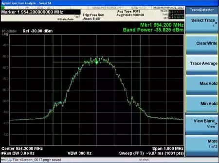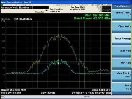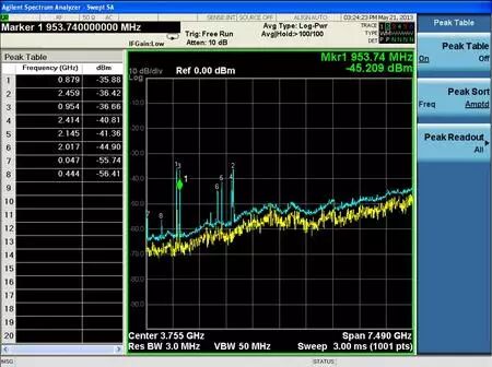 首先找了一个比较稳定的辐射信号做比较。上次为了带回家使用,选了手持频谱仪N9342C。这次在办公室,就可以选个功能和性能更好的台式频谱仪N9000A了。谁叫咱家仪器多呢,怎么也得得瑟一下啊,嘻嘻~