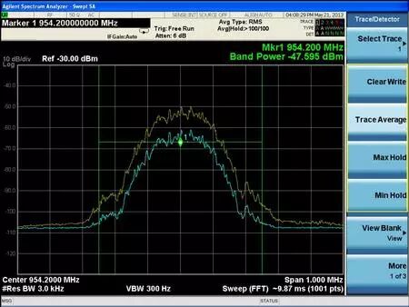 信号测出来大约是-35 dBm (dB 毫瓦)。不算小了。看了两条轨迹线,一会可以比较直观的对比。