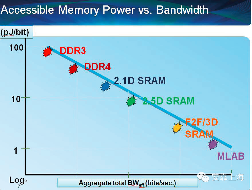图5 模拟数据显示SRAM到FPGA的面对面叠加与用TSV的3D叠加具有相同的能耗和带宽(MLAB是指嵌入式存储或SOC设计)