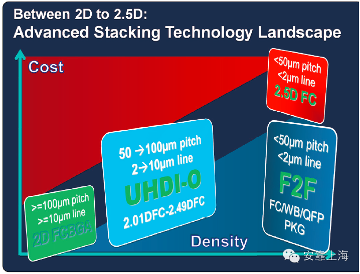 (FCBGA)作为基准点,其互联间距为100um,互联线宽为10um(只有在硅片上才能实现)。随着互联间距和线宽的减小,封装成本增加。当使用超高互联密度(UHDI-O)的封装时,互联间距减至50um;而使用2.5D硅基板封装更可以使互联间距小于50um。这个互联密度增加的趋势也带来了成本的增加。与这个趋势相背离的是面对面的封装形式。无论是倒装(flip chip)的还是引线(wire bonding)的封装方式,在同样互联密度的情况下,成本却得到降低。