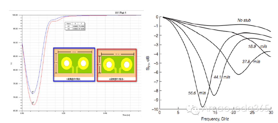 对于3.125Gbps的高速信号细节处理包括:孔的anti pad及stub优化等。下图为Antipad的优化及Stub对信号的影响程度的示图。
