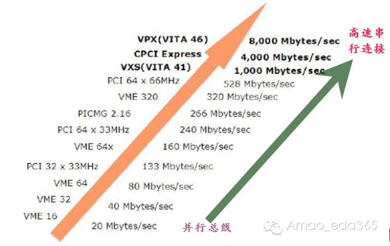 VPX总线采用高速串行总线技术替代了VME总线的并行总线技术。VPX总线引入了目前最新串行总线技术,例如:RapidIO、PCI-Express和万兆以太网等,支持更高的背板带宽。VPX核心交换可以提供32对差分对,每对差分对理论上可以提供10Gbps的数据交换能力,一个VPX模块理论上最高可以提供8GByte/s的数据交换能力。
