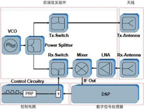 以FMCW为例(图2),毫米波雷达系统主要包括天线、前端收发组件、数字信号处理器(DSP)和控制电路,其中天线和前端收发组件是毫米波雷达的最核心的硬件部分。以下将分别详细介绍。