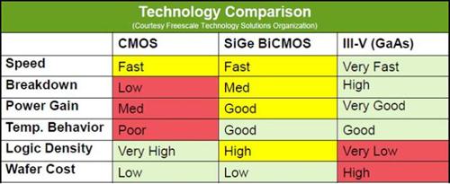 早期的MMIC主要采用化合物半导体工艺,如砷化镓(GaAs)、磷化铟(InP)等。化合物半导体具有大的禁带宽度、高的电子迁移率和击穿场强等优点,但缺点是集成度不高且价格昂贵。所以,近十几年来低成本、集成度高的硅基(CMOS、SiGe BiCMOS等)MMIC发展迅速。图6对这几种MMIC工艺技术的性能进行了对比。