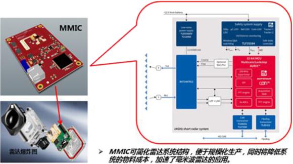 虽然CMOS雷达面临速度和低频噪声等问题,随着深亚微米和纳米工艺的不断发展,硅基工艺特征尺寸不断减小,栅长的缩短弥补了电子迁移率的不足,从而使得晶体管的截止频率和最大振荡频率不断提高,这使得CMOS工艺在毫米波雷达应用方面不断地取得突破。例如,恩智浦(NXP)和德州仪器(TI)陆续推出了基于CMOS工艺的毫米波雷达芯片,其中NXP率先将MCU集成进入了其RF CMOS收发器中。在今年德州仪器(TI)宣称其集成前端MMIC、DSP和MCU单芯片雷达解决方案(AWR1642)已实现了大规模量产,相比于传统的24GHz方案,其外形尺寸缩小33%、功耗减少50%、范围精度提高10倍以上,且整体方案成本更低。