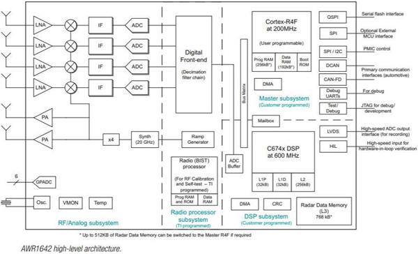图7、德州仪器(TI)AWR1642毫米波雷达芯片的高级架构框图