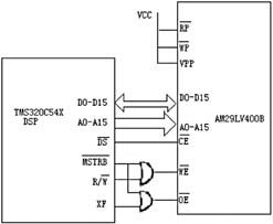 另外,由于FLASH存储器与EPROM相比有更高的性价比,而且体积小,功耗低,可电擦写,使用较方便。因此,本系统也扩展了一片FLASH存储器,图2为DSP与FLASH的接口电路。FLASH芯片为AMD公司的AM29LV400B,该芯片为单电源供电,支持整片擦除,每个分区有保护,避免意外擦除,并且使用寿命很长。