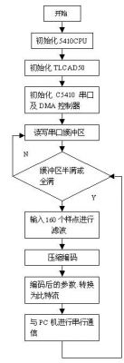 * @& H3 X* S V整个下位机部分的程序流程图如图4所示,其中滤波部分为一个FIR高通滤波算法。这是因为主要采集的对象为语音信号,而TLC320AD50内部只有一个低通滤波器,可以用于滤除高于3.4kHz的干扰信号,但是对于低于300Hz的干扰则无能为力,所以针对DSP编程设计一个FIR高通滤波器滤除低频干扰。FIR滤波器在数学上可表示为: