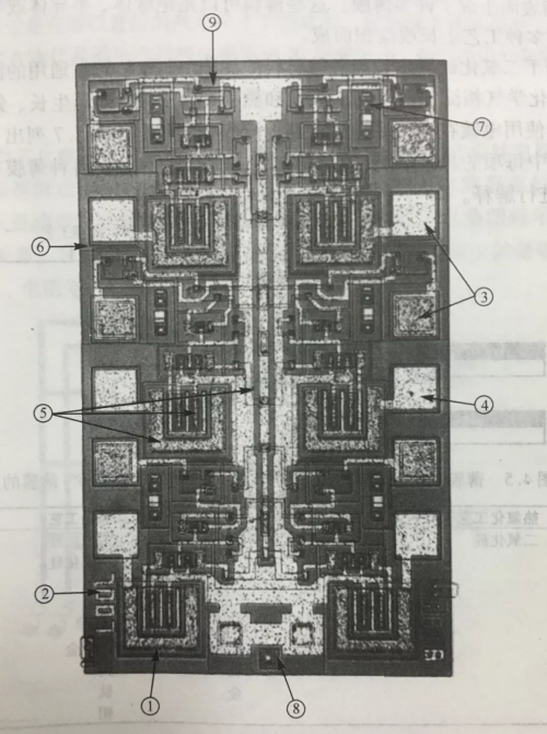 下图是一个中规模(MSI)/双极型集成电路的显微照片。之所以选择这个集成等级,是为了照片上能显示出电路的具体图形。对于更高集成度的电路,它的元件非常小,以至于在整个芯片的显微照片上无法辨认。