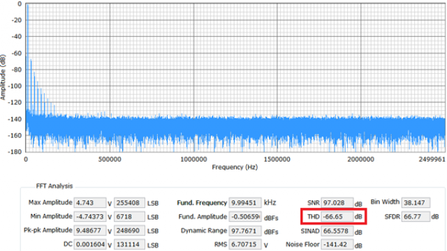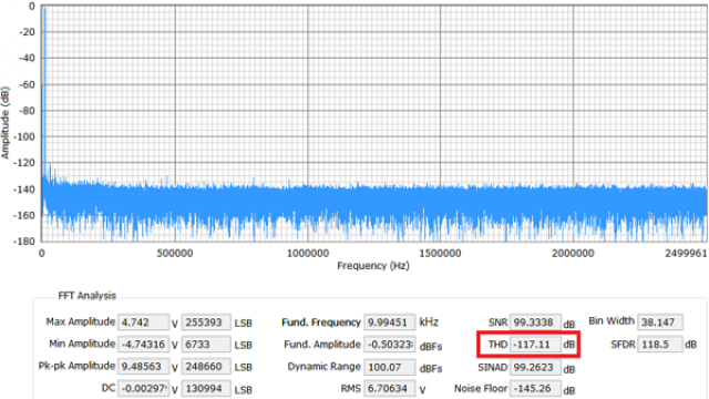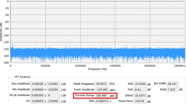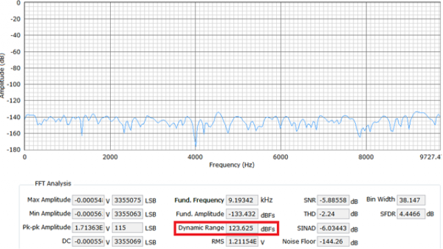 在应用笔记AN-1279 中,256×过采样下18 位AD7960 ADC 的实测动态范围为123 dB。这是用于高性能数据采集信号链,如光谱分析、磁共振成像(MRI)、气相色谱分析、振动、石油/ 天然气勘探和地震系统等。