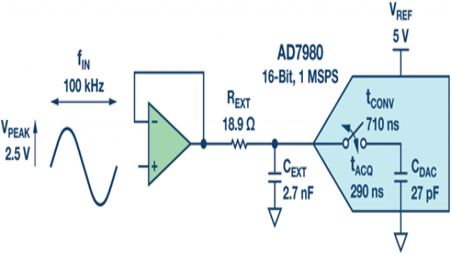 算出的RC 滤波器是一个低通滤波器,截止带宽为3.11 MHz。但是,某些设计人员可能会意识到,3.11 MHz 远大于100 kHz 的输入信号频率,因此,该滤波器无法有效降低带外噪声。为实现更高动态范围,可以换用590 Ω 电阻,以获得100 kHz 的 –3 dB 带宽。这种方法主要有两个问题。由于通带中会有更多衰减,对于AD7980 ADC 示例,100 kHz 附近的幅度衰减最高可达30%,因此,信号链精度会大大降低。带宽越小,则建立时间越长,这使得AD7980 的内部采样保持电容无法在指定的采集时间内完成充电,因而无法执行下一次有效转换。这导致ADC 转换精度降低。