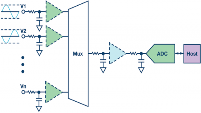 对于这些通道,可以在多路复用器之后使用一个单通道滤波器,使得设计更简单,成本更低。如上所述,模拟滤波器必定会引入建立时间。每次多路复用器在通道间切换时,该单通道滤波器都必须充电到所选通道的值,因而会限制吞吐速率。为提高吞吐速率,可以在多路复用器之前为每个通道添加一个滤波器,但这样做会提高成本。