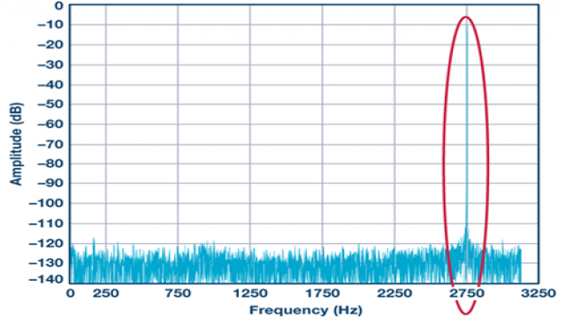 EVAL-AD7606/EVAL-AD7607/EVAL-AD7608EDZ 评估板可以每通道200 kSPS 的速率运行。在下面的测试中,配置其采样速率为6.25 kSPS,过采样比为32。然后,将一个3.5 kHz –6 dBFS 正弦波施加于AD7606。图9 显示2.75 kHz (6.25 kHz –3.5 kHz) 处有一个–10 dBFS 混叠镜像。因此,若ADC 之前没有合格的抗混叠模拟滤波器,当使用过采样时,数字滤波器就可能会因为抽取而引起混叠镜像。应使用模拟抗混叠滤波器来消除这种叠加于模拟信号上的噪声尖峰。