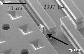 Walraven A J A等人的研究发现,较大ESD脉冲引起梳齿的运动,导致其与基底发生粘附失效,同时也造成了短路失效。此外,在梳齿的尖端还发现了熔化或者“点焊”现象。