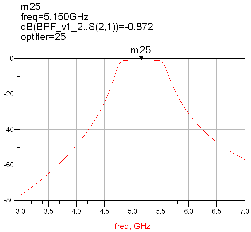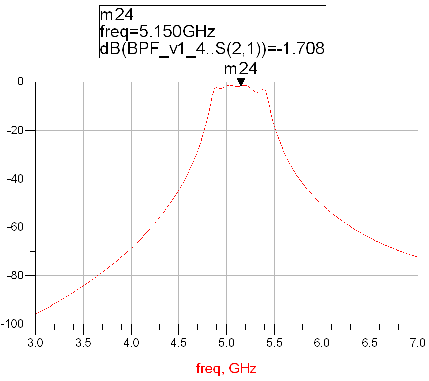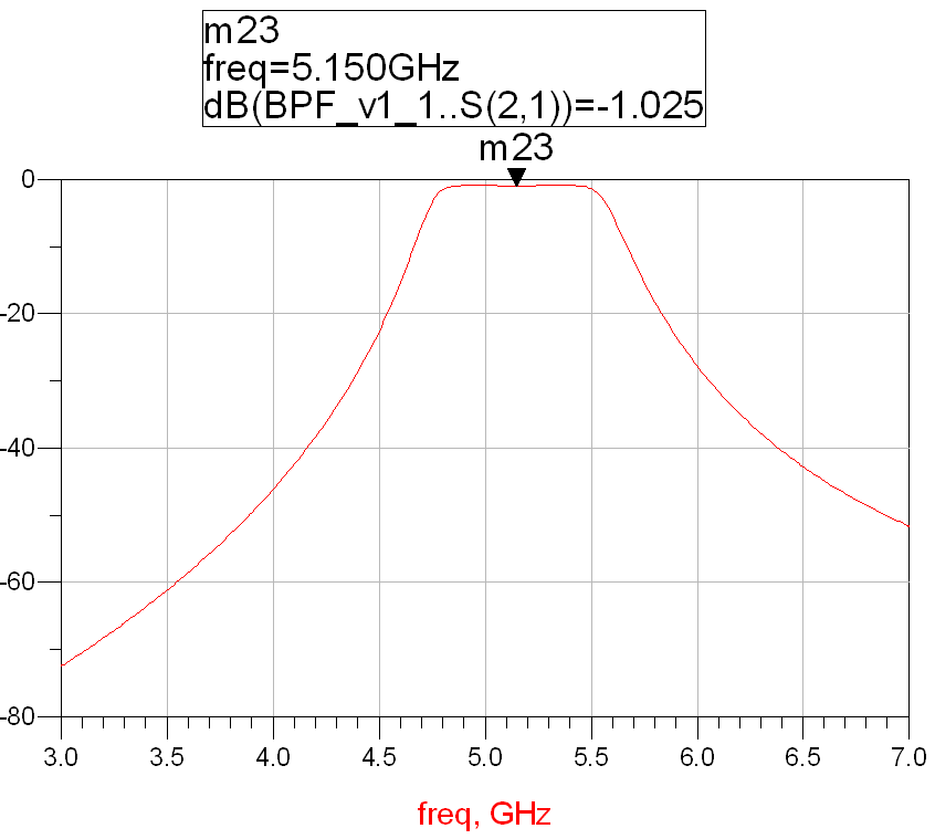 ; B9 U% R7 Y3 B% y将新的电路结构尺寸和高频板材RT/duriod 5880指标带入到设计当中,我们得到电路的频率响应: