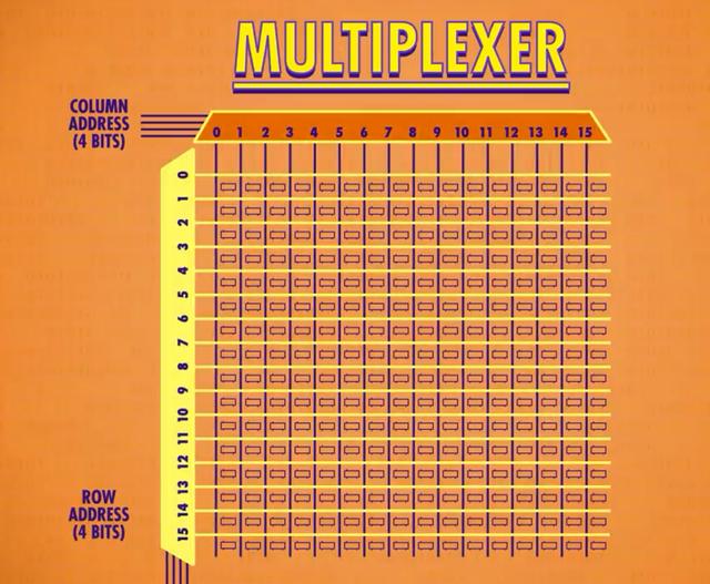 ; A. C+ J0 F0 x' Q$ I为了将地址转成行和列,我们需要一个叫“多路复用器”的部件,它的工作方式是:当输入一个4 bit数字时,它会把那根线连到相应的输出线,如果输入0000,它会选择第一列;如果输入0001,则选择下一列,依此类推。