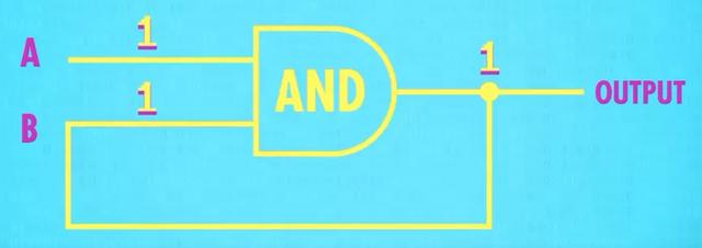 将A和B都设为1,“1 AND 1”的输出是1;如果将A变为0,输出0,输出回到B,B变为0,后面再怎么改变A的值,输出仍然为0,这个电路记录0。