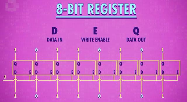 8 Q4 ^/ z6 `3 U: Q2 w刚刚我们只存了1bit,没什么大用,但如果我们并排放8个锁存器,就可以存8位信息,这个8bit数字组的锁存器叫“寄存器”,寄存器能存多少个Bit叫“位宽”。