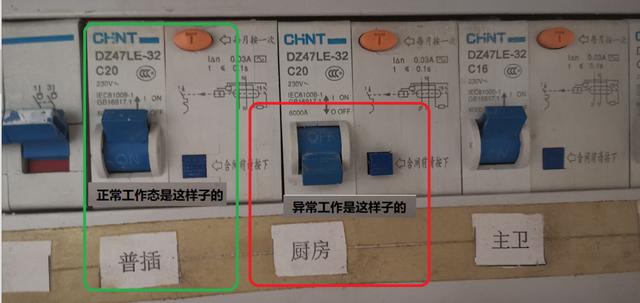我就把蓝色小按钮按下,然后合上开关,发现无论如何处理都无法合上,一直处于异常工作状态。我把这个信息告诉妻子,她说之前厨房也经常发现跳闸现象。(但都是LP自己处理合上开关的,因此我之前真不知道还有这样的故事,哈哈哈)