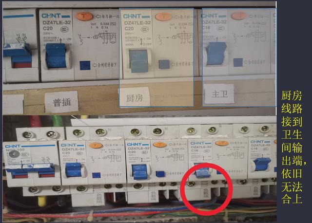 为了验证是否是空气漏电保护器损坏,我把厨房的电源走线接入旁边卫生间的电源线路上去,发现还是不行,漏电保护装置依旧无法合上;同时把卫生间的线路进入厨房的漏电保护装置,厨房漏电保护装置可以合上而且供电正常。
