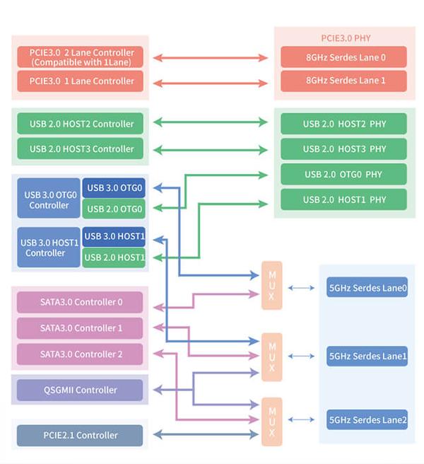 丰富接口 高效拓展FET3568-C核心板拥有丰富的高速接口,可以使功能扩展、连接更为高效和简单。支持最多3路PCIe(其中2路为PCIe3.0),4路独立USB(其中2路为USB3.0),同时具有3路SATA3.0控制器;内置双GMAC,支持RGMII/SGMII/QSGMII(2MAC)接口,支持8路UART以及2路千兆以太网(通过PHY芯片)。