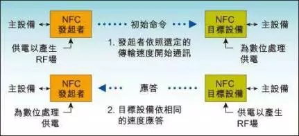 支持NFC的设备可以在主动或被动模式下交换数据。在被动模式下,启动NFC通信的设备,也称为NFC发起设备(主设备),在整个通信过程中提供射频场(RF-field),它可以选择106kbps、212kbps或424kbps其中一种传输速度,将数据发送到另一台设备。另一台设备称为NFC目标设备(从设备),不必产生射频场,而使用负载调制(load modulation)技术,即可以相同的速度将数据传回发起设备。此通信机制与基于ISO14443A、MIFARE和FeliCa的非接触式智能卡兼容,因此,NFC发起设备在被动模式下,可以用相同的连接和初始化过程检测非接触式智能卡或NFC目标设备,并与之建立联系。