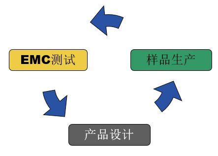 产品设计--样品生产--EMC 测试--测试不通过--整改--更改设计--样品生产--测试通过。