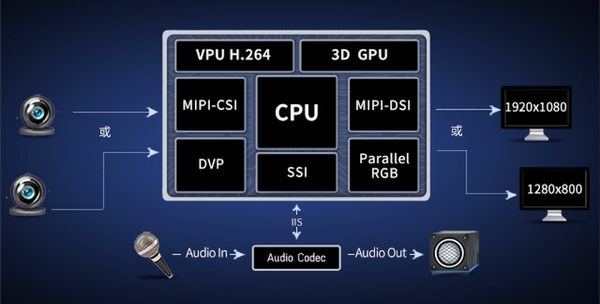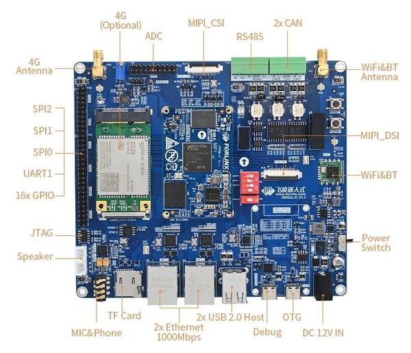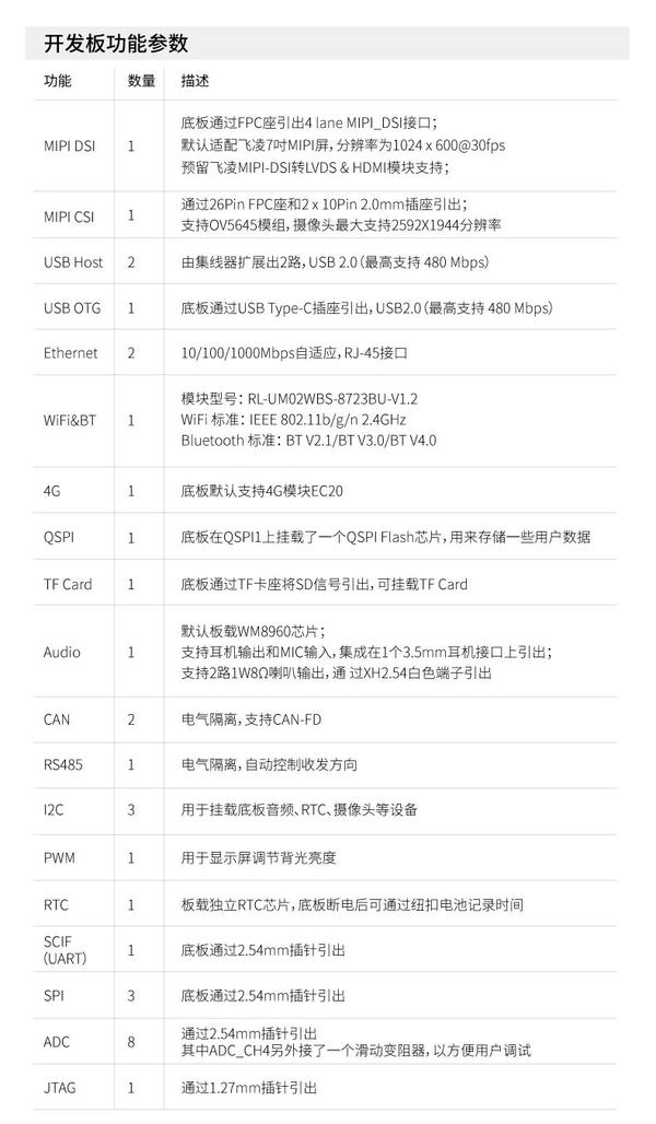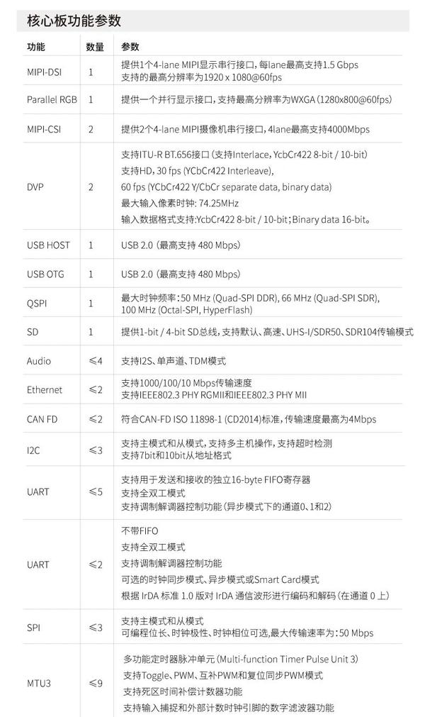其具备2路千兆以太网、2路CAN-FD、2路USB 2.0、7路UART、MIPI-DSI、Parallel RGB、MIPI-CSI、DVP、SD、IIS、IIC、SPI、QSPI、PWM、ADC等常用功能接口,助力用户开发产品不受功能局限。