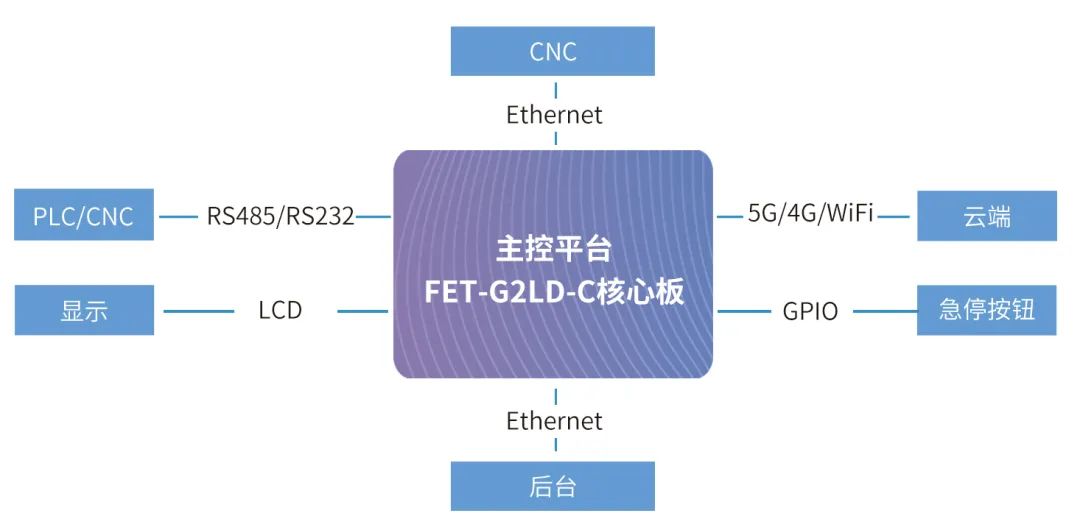 采用FET-G2LD-C核心板进行工控设备HMI开发,在实现高性能人机交互的同时可满足工控设备的各种状态数据监测与采集,并通过有线网络、4G/5G、WiFi、ZigBee等无线通信方式进行数据的收发,支持多路RS485/RS232和双路千兆以太网,可满足多节点PLC/CNC的连接。