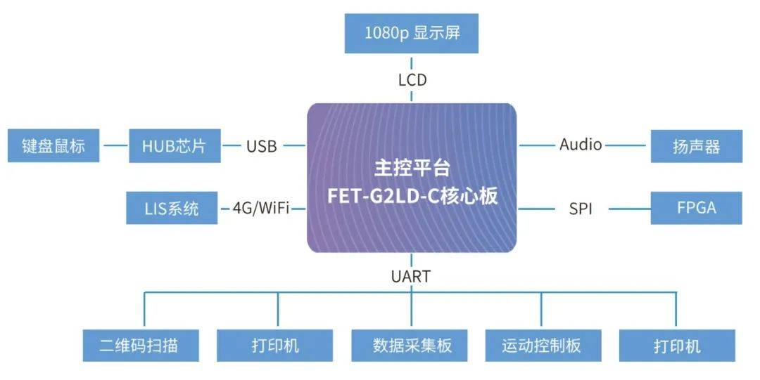 FET-G2LD-C核心板支持MIPI(最高分辨率1920*1080)和RGB(最高分辨率1280*800)显示接口,可灵活适配多种型号显示屏。支持≤4路Audio,可进行外放声音输出;支持5路UART,可用于连接下位机及各串口打印机、扫码器等;支持2路USB,可连接各种外设及U盘等;支持2路Ethernet,可连接医院LIS系统和HIS系统。
