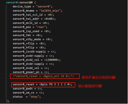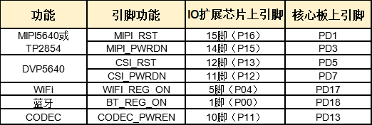 扩展芯片上的IO口被WiFi、蓝牙、MIPI摄像头TP2854、DVP摄像头和line-out口电源使能引脚引用,若想保留这些功能,就要使用核心板其他可复用为这些功能的引脚。