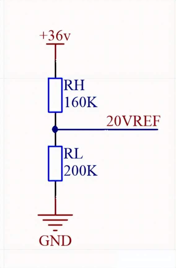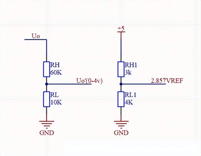 设计思路:将20v到28v中的8v压差全部映射到0-3.3v的范围内,才能更好的利用AD模块,所以首先将Uo与20V做差分,将电压抬低到0-8v(注:有时碍于仪放信号输入电压的范围较小会先分压再抬低见形式二),然后通过电阻分压将8v映射到3.3v的范围内。
