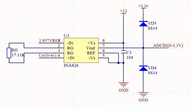 2、差分并放大2.887倍及钳位电路(计算方法:3.3/(4-2.857),差放直接输入给AD不需要阻抗匹配)