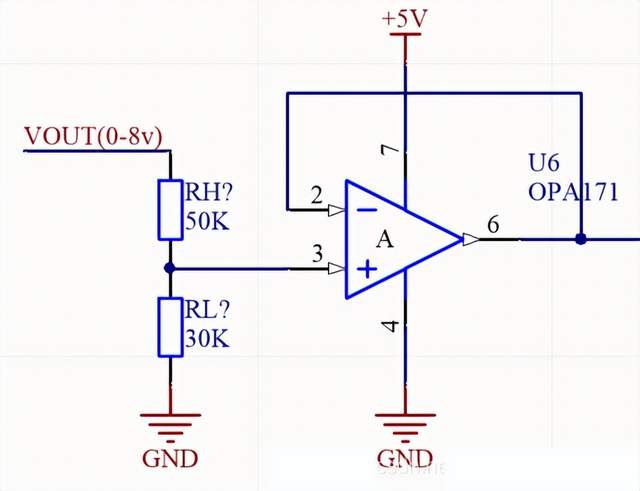 4 `) b; {/ ~3 q! Z8 b( @. I3、分压及输出阻抗匹配(电压跟随器)