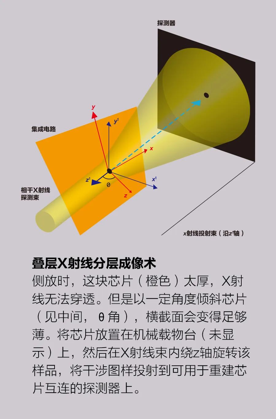 在每个照明点,相干X射线在穿过芯片弯弯曲曲的互连铜塔时会发生衍射,将图样投射到探测器上,图样会被存储下来以供后续处理。记录下来的投影包含了有关X射线穿过的材料的信息,足以确定其三维结构。这种方法被称为“叠层X射线计算机断层成像术”(PXCT)。叠层成像术是一种通过光线的干涉图样产生物体图像的计算过程。