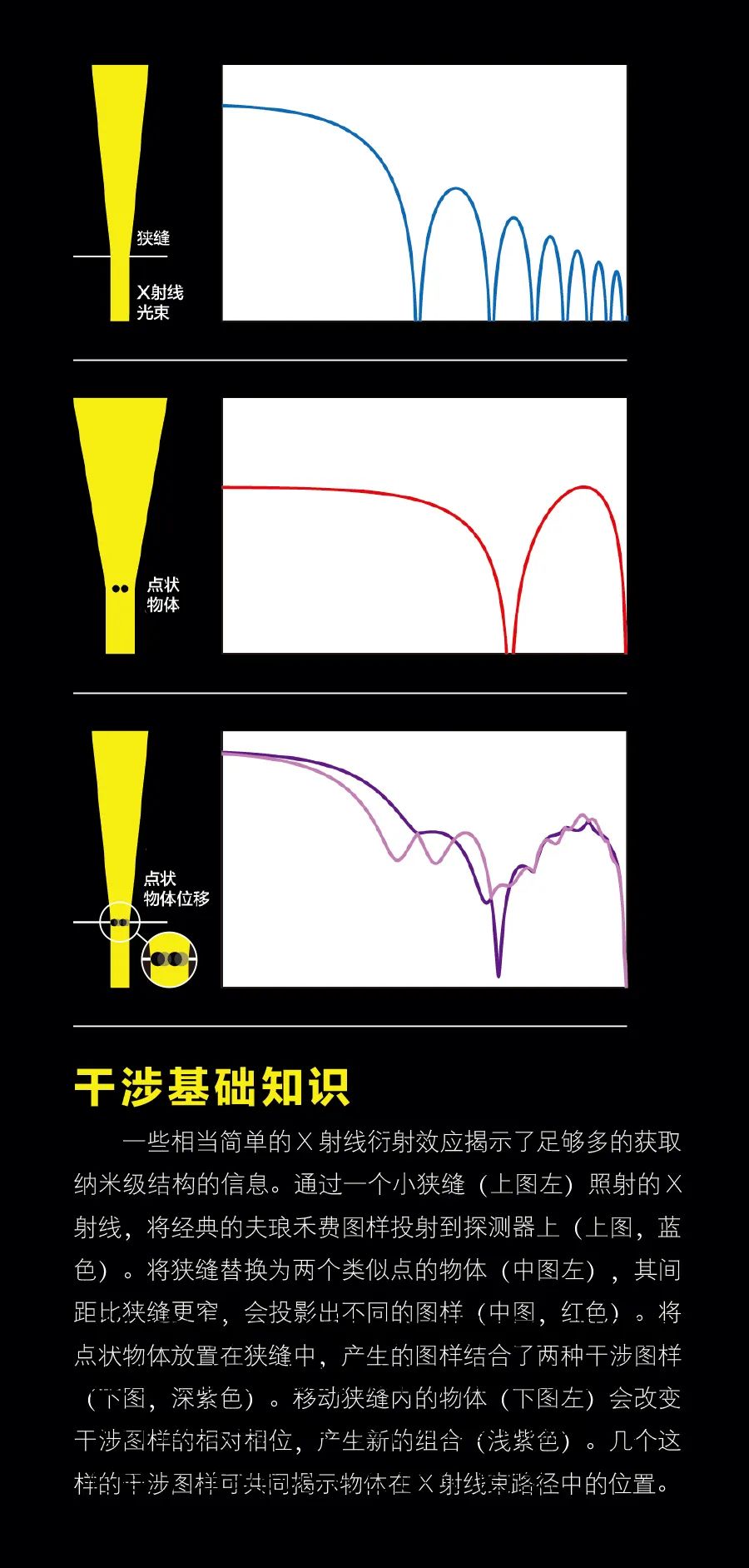 虽然这两种现象本身都不能让你重建微芯片中错综复杂的互连,但如果把它们结合起来,你就会明白其中的原理。将这对物体放入狭缝中,产生的干涉图样是由狭缝和物体的组合形成的衍射所产生的,它揭示了狭缝的宽度、物体之间的距离以及物体和狭缝的相对位置等信息。如果稍微移动这两个点,干涉图样将会发生位移。正是通过这种位移,我们可以精确计算出物体在狭缝中的位置。