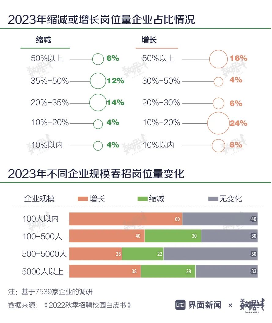 但好消息是:根据《2022秋季招聘校园白皮书》显示,2023年计划扩招的企业占比,还是大于缩招企业的。