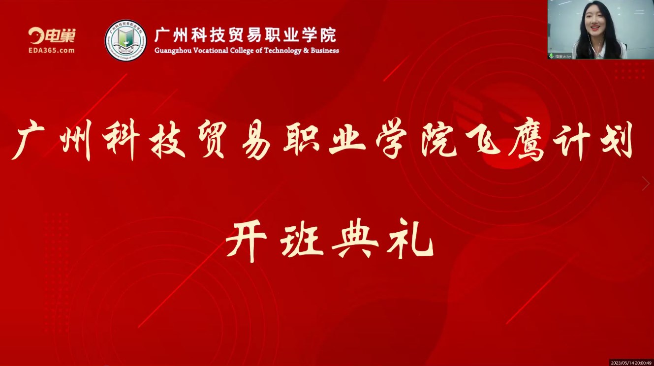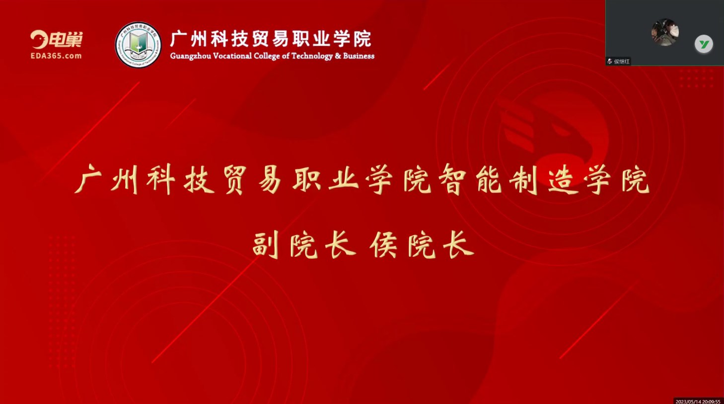 深圳电巢联合广州科技贸易职业学院智能制造学院共同举办飞鹰加速器计划2023级052班开班典礼,以线上直播的形式在5月14日顺利举行,本次的开班典礼邀请到广州科技贸易职业学院智能制造学院副院长侯院长、广州科贸智能制造学院教师孙志兵、电巢科技专家中心总经理贾可、电巢科技教务梁柳荣等嘉宾参与此次活动。