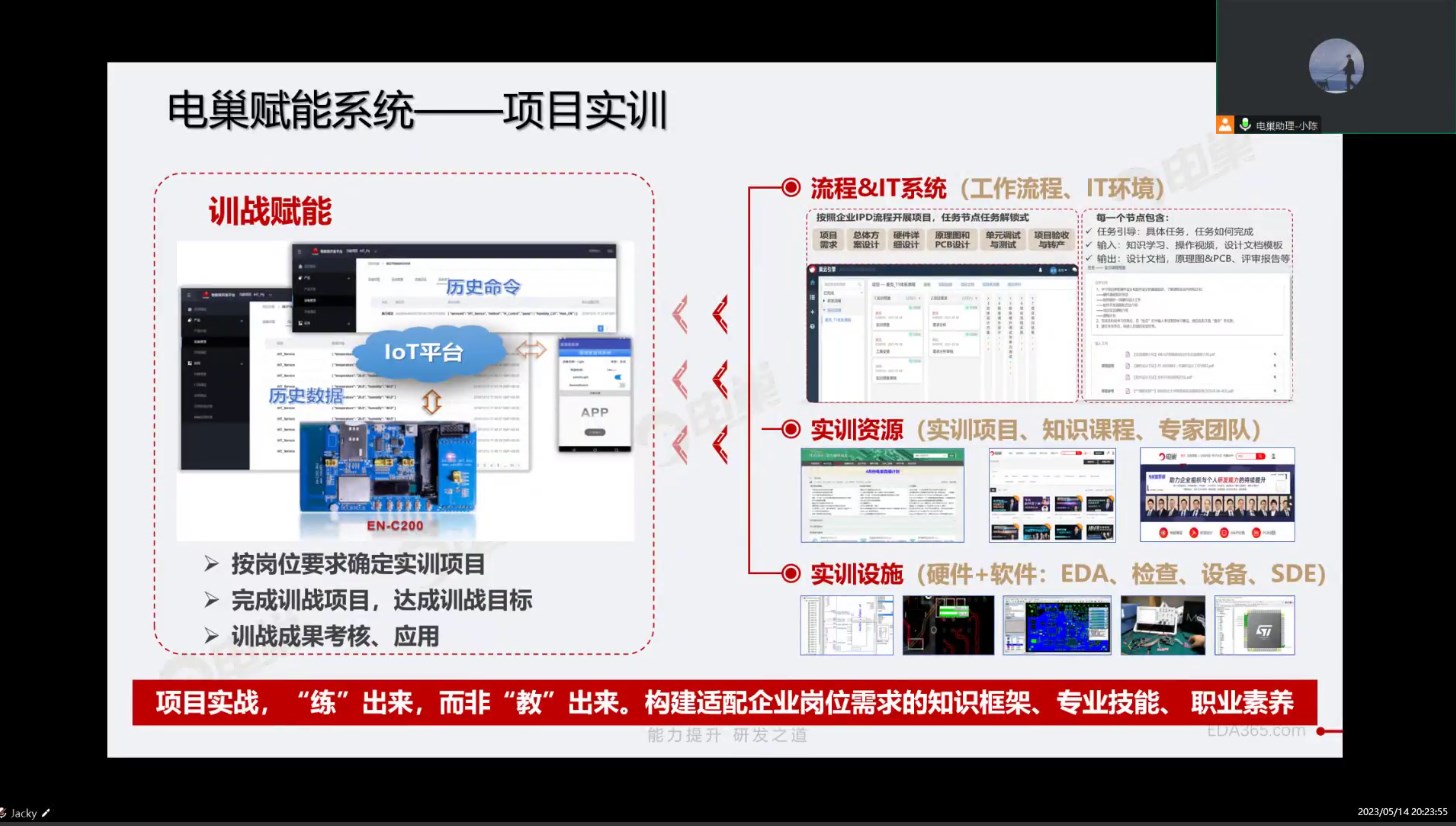 随后,电巢科技专家中心总经理贾可通过三部分内容给同学们讲解了飞鹰计划。从企业需要的适配人才出发,分析了电子工程师在职业道路上需要具备的职责、能力与标准。而电巢推出的“飞鹰计划”,与高校合作实现培养前移,完成企业需要的人才培养,并且着重介绍了本次实训的课程体系与特点,通过具体的物联网实训项目,在学习中不仅能感受企业研发环境、产品开发流程、研发专家职业风范,还能学习到专业知识、工程能力及职业素养。他强调理论需与实践相结合,相信通过飞鹰计划的实训,同学们均可成为有技能、懂流程、守规范、集经验、高效率与一身的优秀电子人!