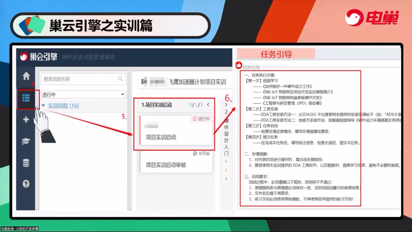 最后电巢科技教务陈志微为同学们介绍了电巢学堂学习指南、巢云引擎实训指南以及答疑板块,让同学们对此次飞鹰实训的学习路径清晰明了。