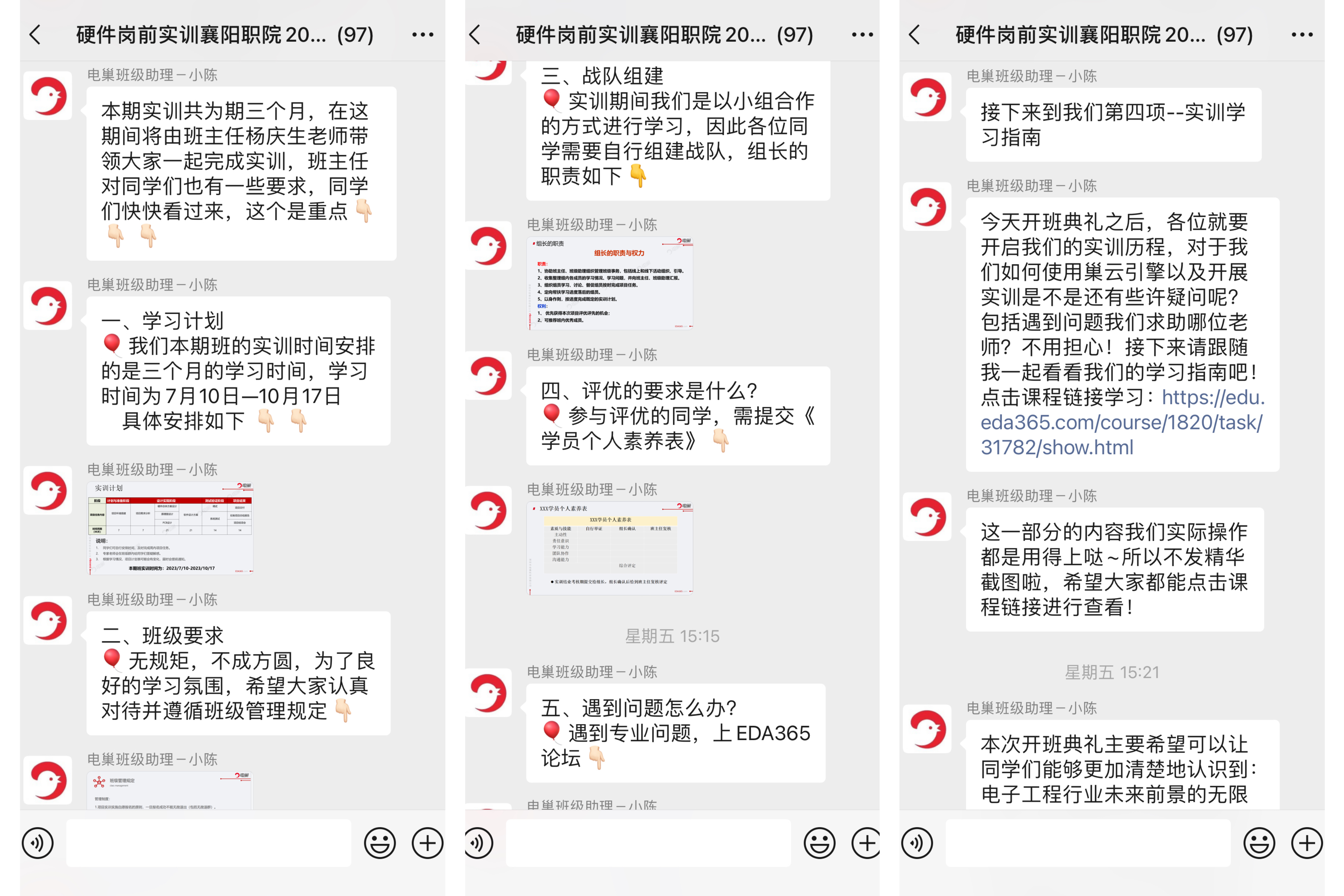 紧接着,电巢科技教育培训事业部教务专员陈志微在学习群内介绍了学习计划、班级要求、战队组建和评优标准。最后,在群内分享了实训学习指南的视频。