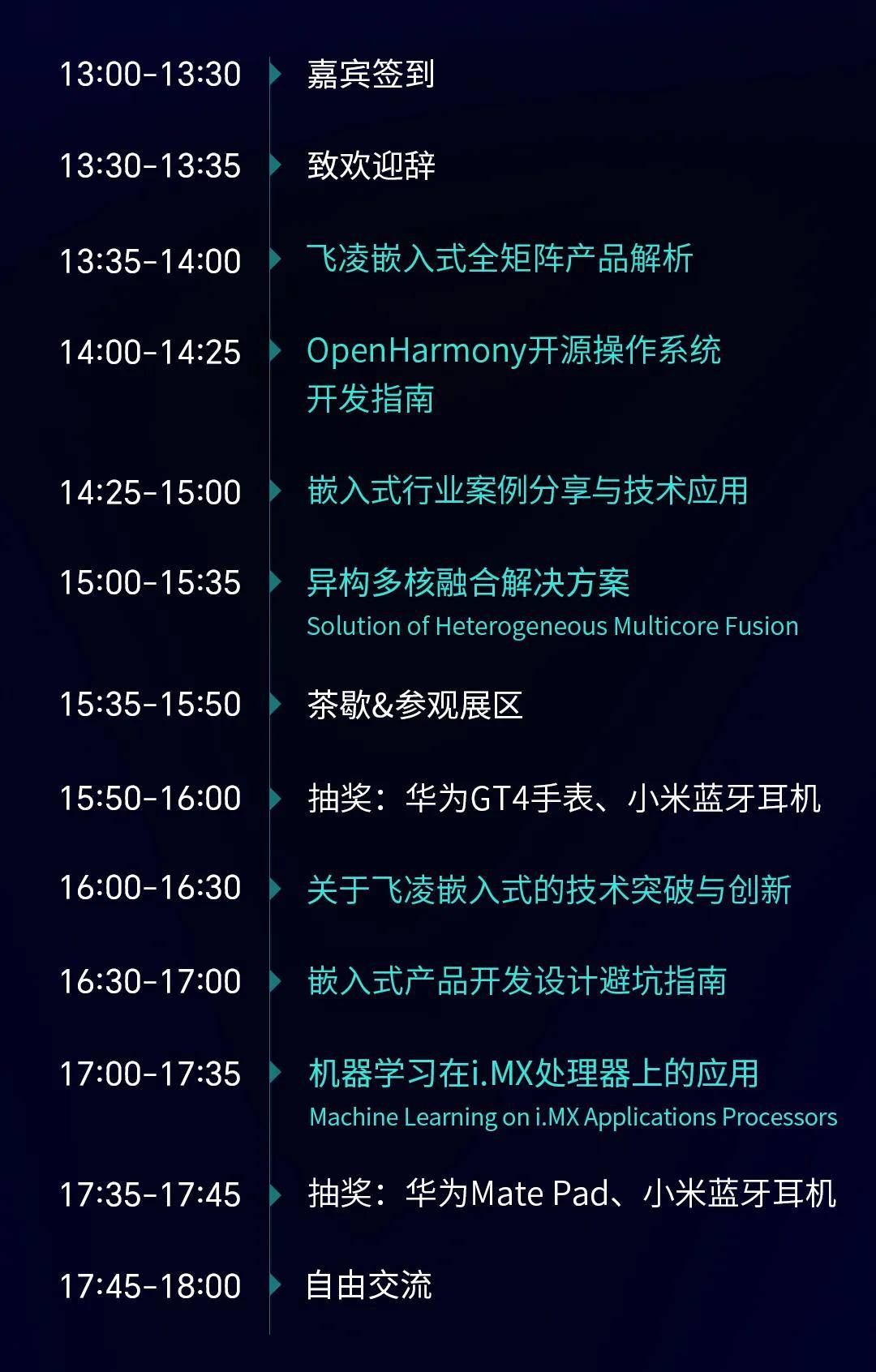% H. C$ L& K9 u& x* f$ \0 m+ k2、前沿干货飞凌嵌入式技术创新日将为大家呈现一系列前沿内容,与会者可以深入了解飞凌嵌入式全线产品矩阵、获得OpenHarmony开源操作系统开发指南、学习异构多核融合解决方案等等,紧密结合当前行业热点和前沿技术,干货满满,为您的项目开发助力。