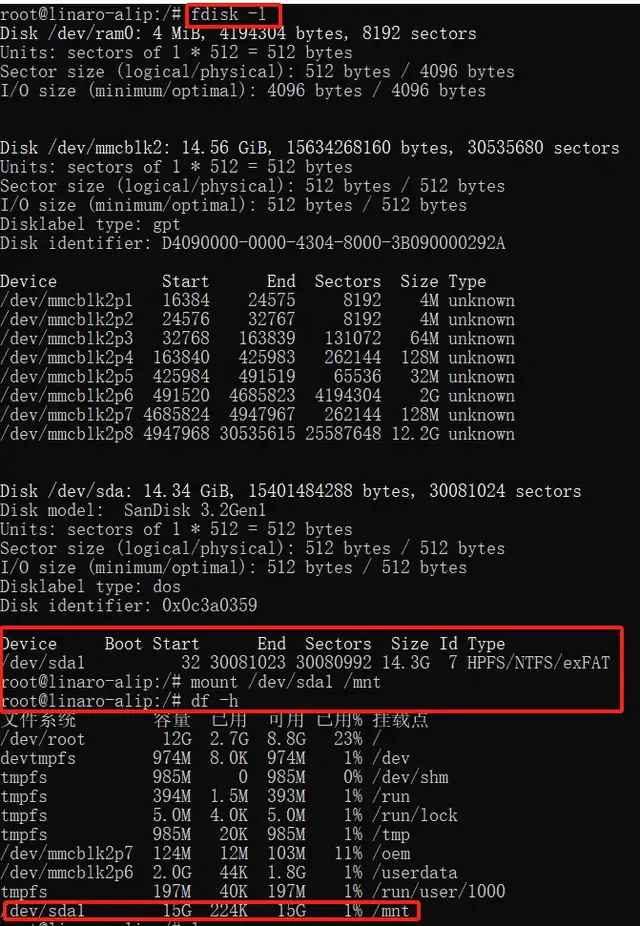 #查看U盘的节点fdisk -l#挂载U盘到mnt目录mount /dev/sda1 /mnt#查看是否挂载成功df -h