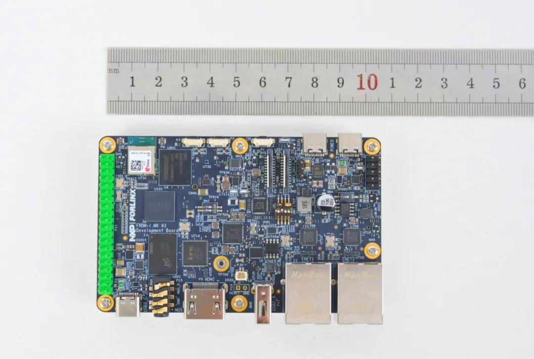 开箱初体验——体积小巧,功能全面打开FRDM i.MX 93开发板小巧的包装,首先映入眼帘的是开发板紧凑而精致的设计,用直尺大致测量一下,开发板的长边也仅有10.5cm左右。尽管体积小巧,但开发板上的每一个元件都经过精心布局,确保了功能的全面性和稳定性。