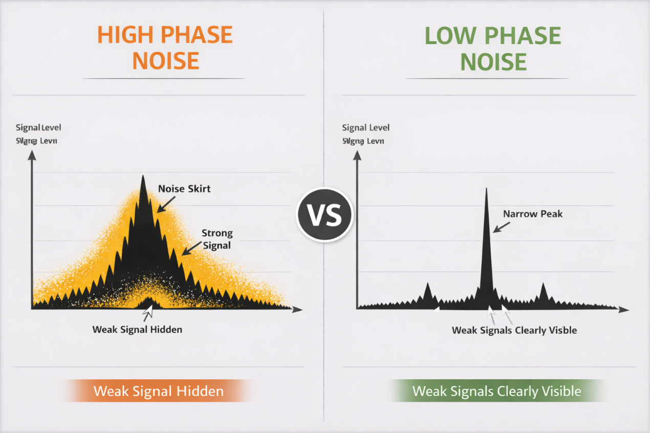 - E D: i: a" Z6 t8 ~8 q! r一、为什么必须“超低相位噪声”? 本质:避免把“仪器噪声”当成“被测信号” 频谱仪内部结构(简化): ·晶振 \uE2 本振(LO) \uE2 混频 \uE2 显示频谱 如果晶振相位噪声高,会发生: 1.产生“噪声裙边”(最致命) ·强信号两边出现扩展的噪声底 ·类似“拖尾” 后果: ·邻近的小信号直接被淹没 ·看不到杂散、干扰、谐波 6 J$ K) G& n$ A& n- \, x' _5 S