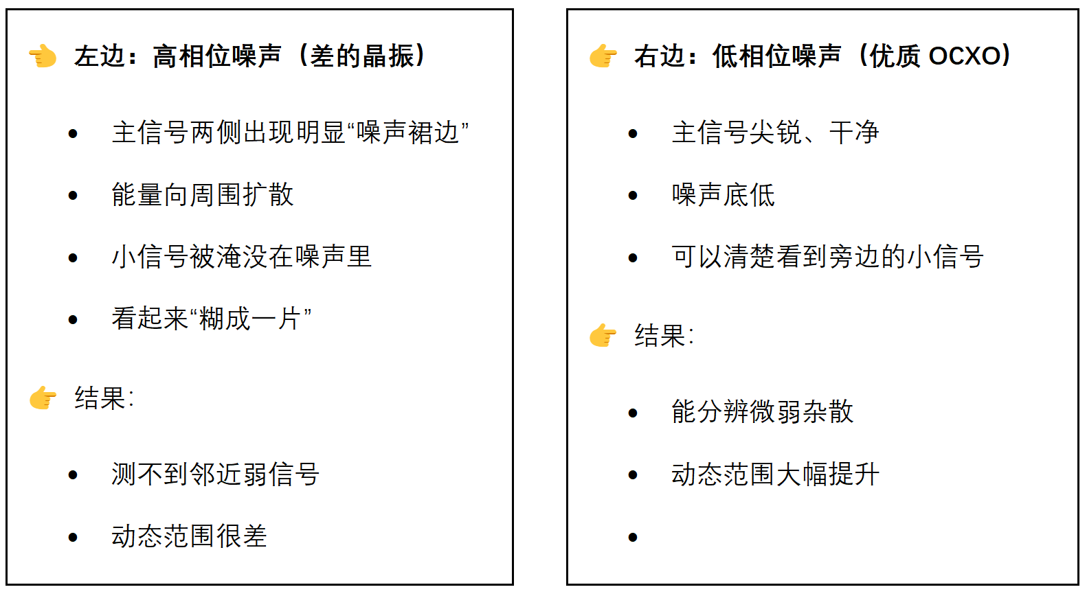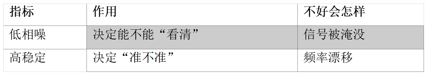 3.测谁都带“模糊滤镜” 即使输入是理想纯净信号: ·输出仍然变“胖”(谱线变宽) 说明: ·测量结果被仪器自身限制 高低相噪对比图如下: 二、为什么必须“高稳定(恒温晶振 OCXO)”? 本质:保证“频率基准不漂移” 晶振频率 = 所有测量的“尺子” 4 y9 a( l6 b# o